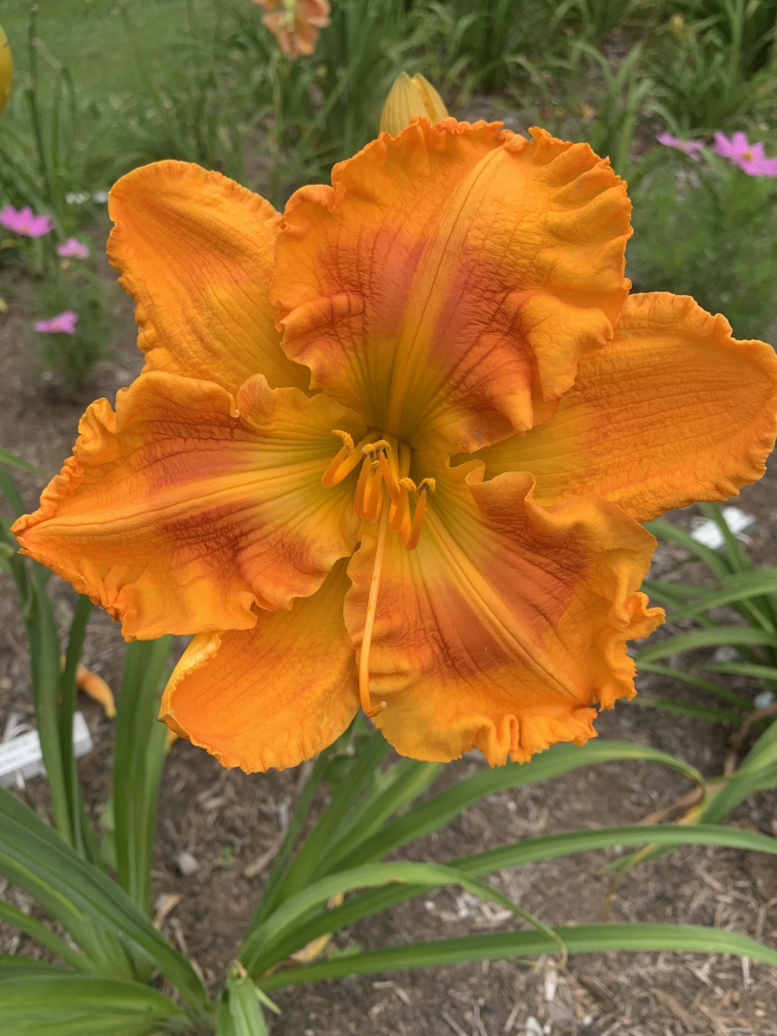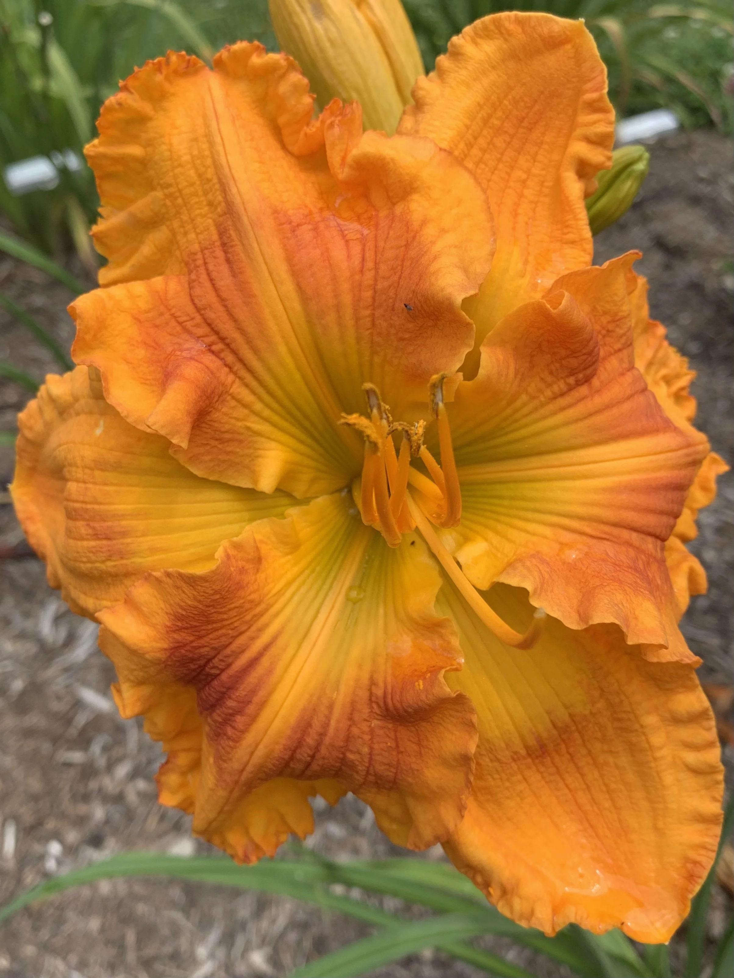 Stunning bright gold with orange band and gold midribs over yellow green throat. Colorfast even on the hottest day. A garden favorite among visitors!