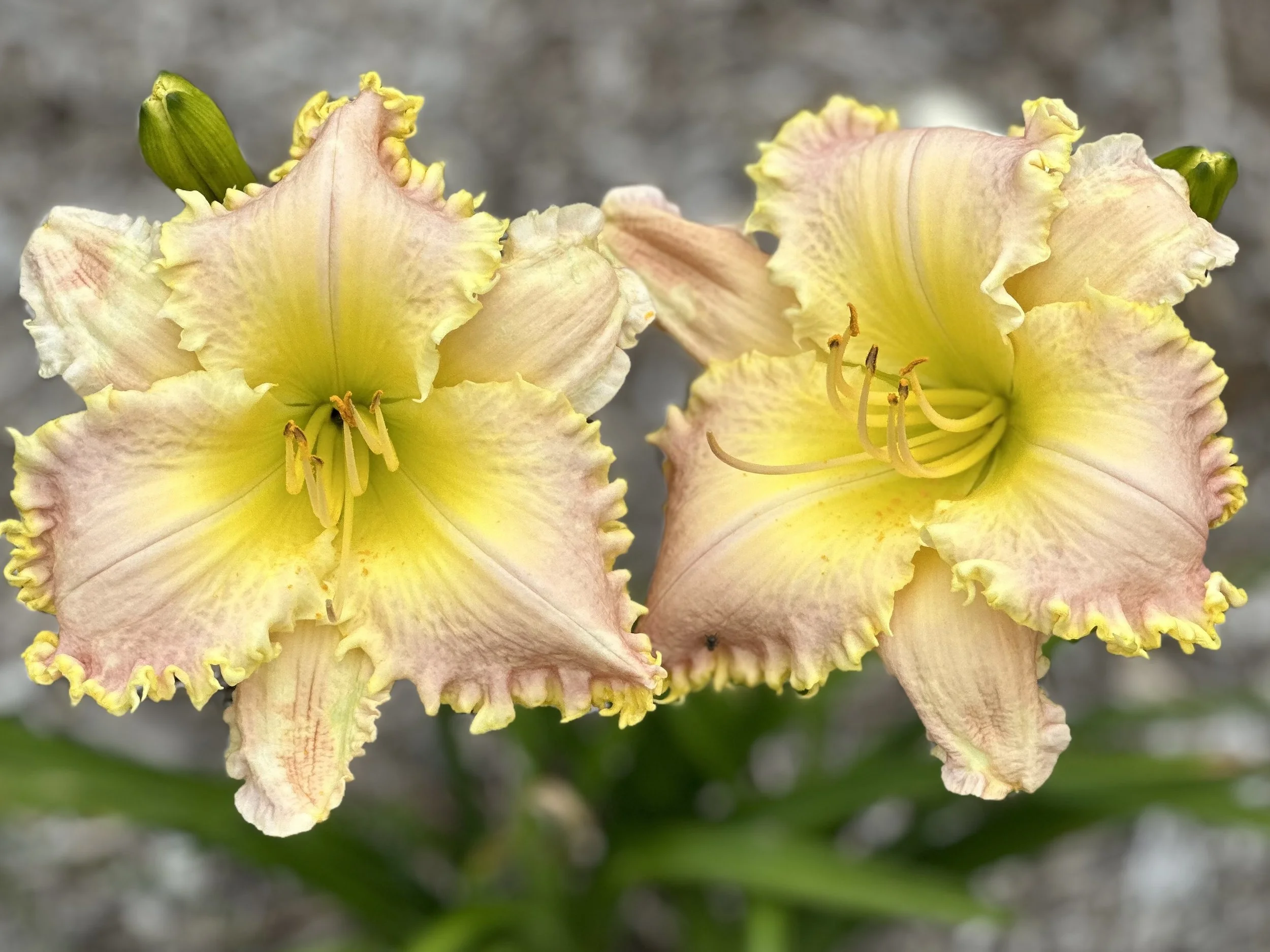 Delicate orchid pink blush flower with ornate creamy yellow filagree edges. Heavy bloomer and very showy!