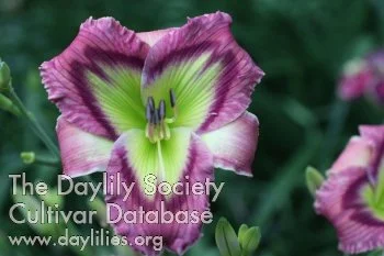 Medium purple petals, lighter sepals, dark purple chevron eye, emerald green throat. Stunning!