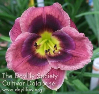 Rose with a lighter rose edge and multicolored patterned eye above a green throat fertile both ways.