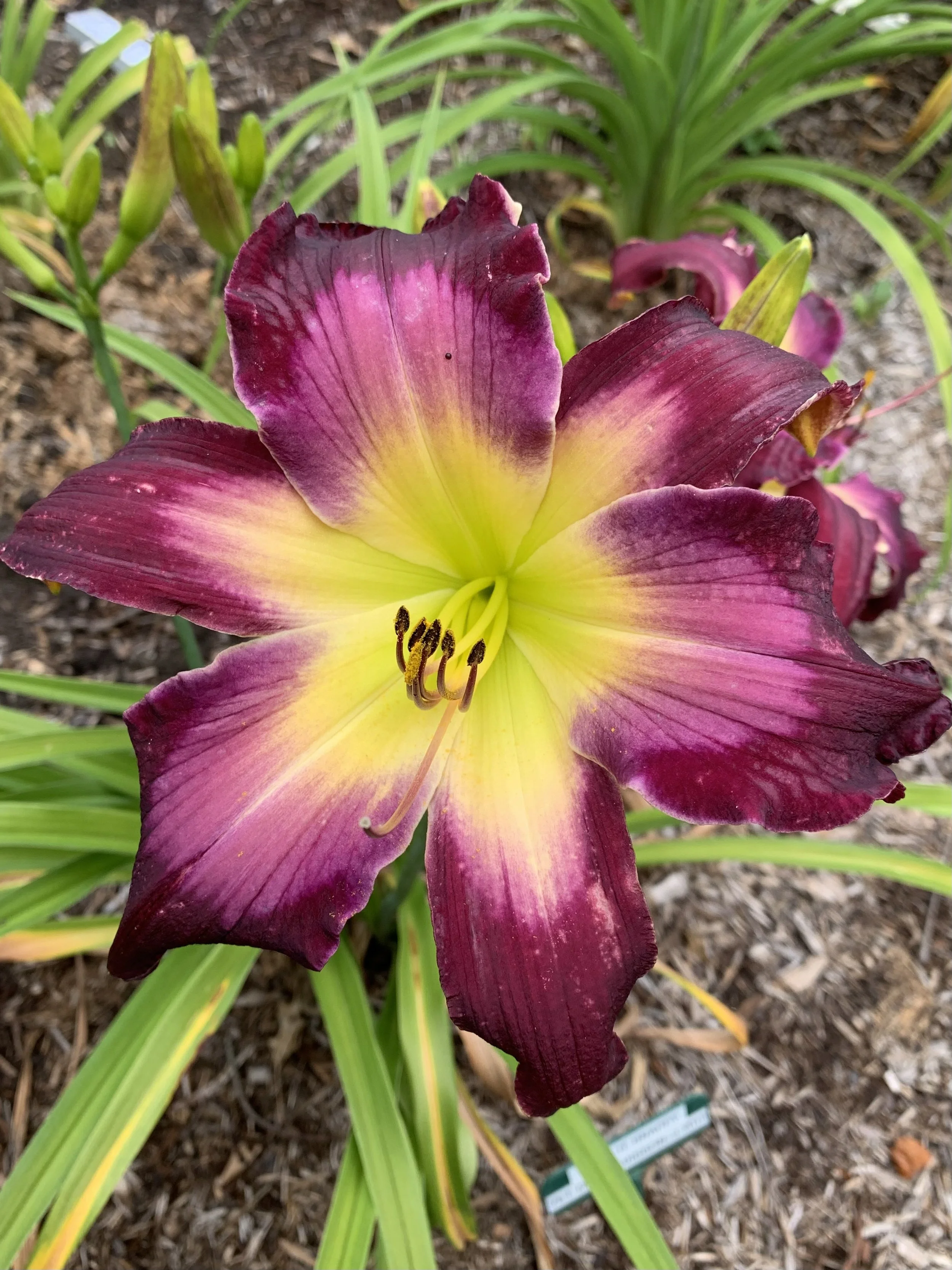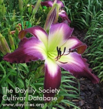 Dark purple with a raspberry feathered watermark and a wide ivory to green throat.