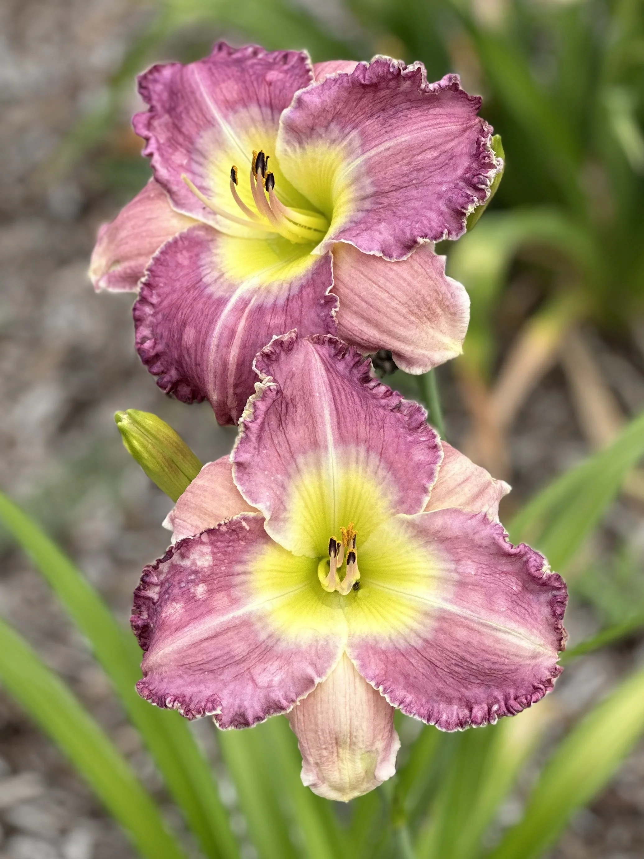 Dark lavender with a pale lavender watermark surrounded by a darker band, pale lavender ruffled edge and green throat. Great performer.