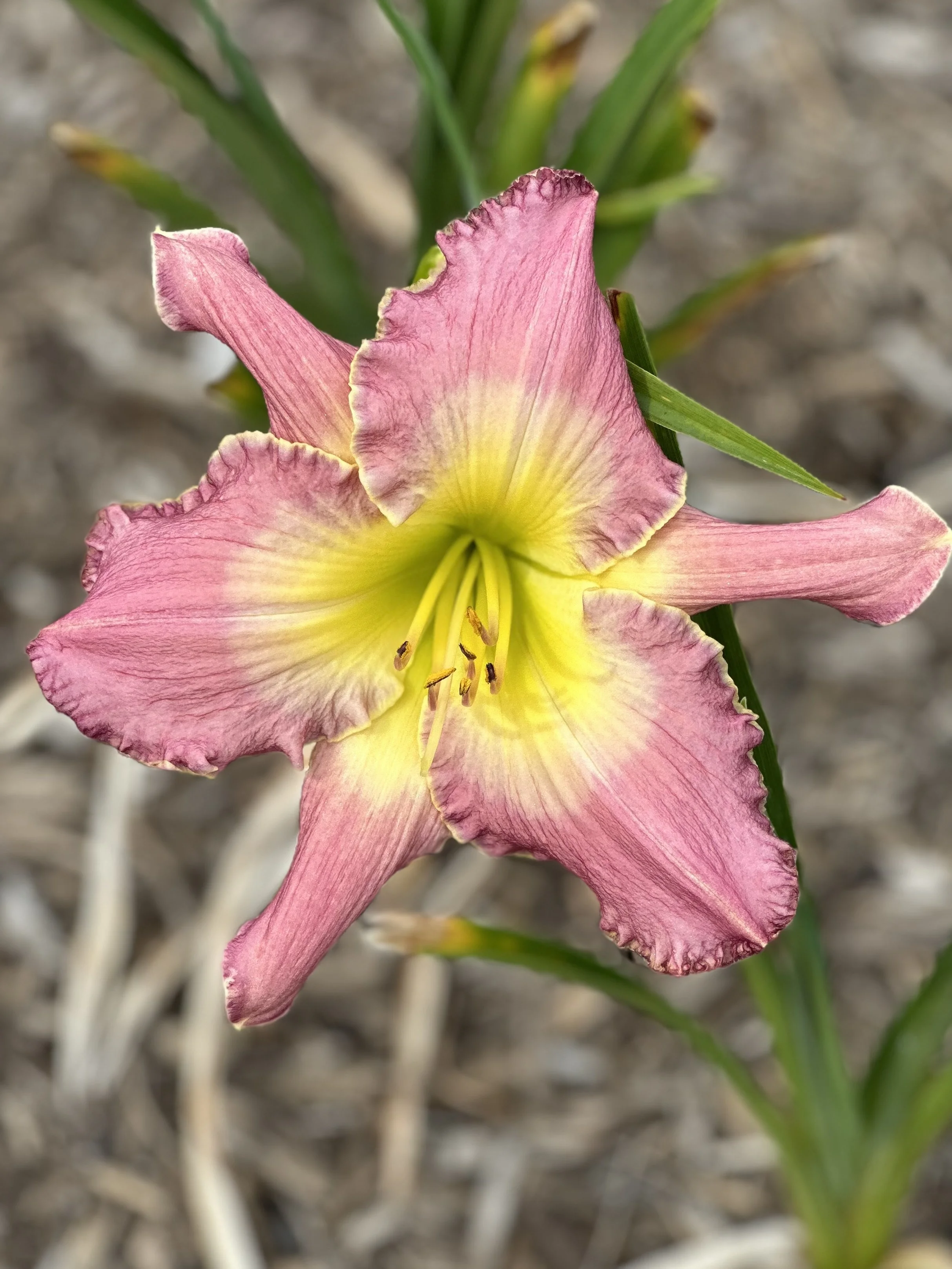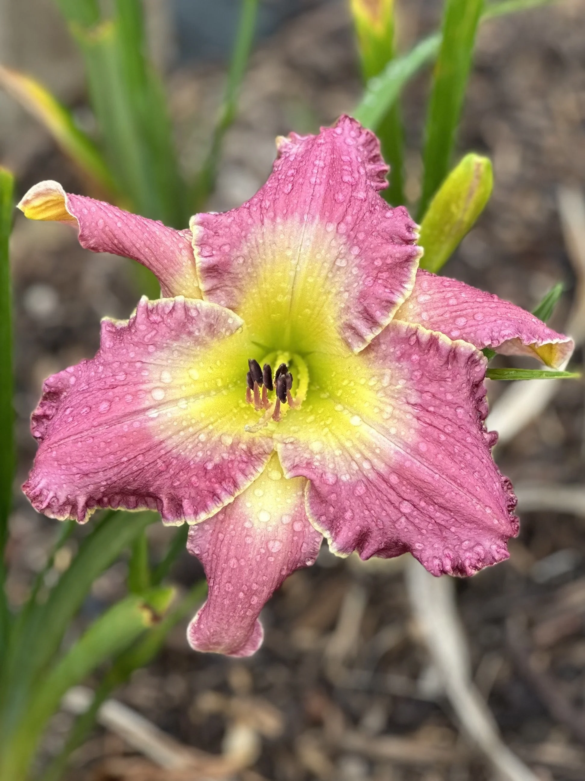 Lilac purple with lighter watermark and ruffled white picotee with owl ears and angel wings over yellow to green throat.
