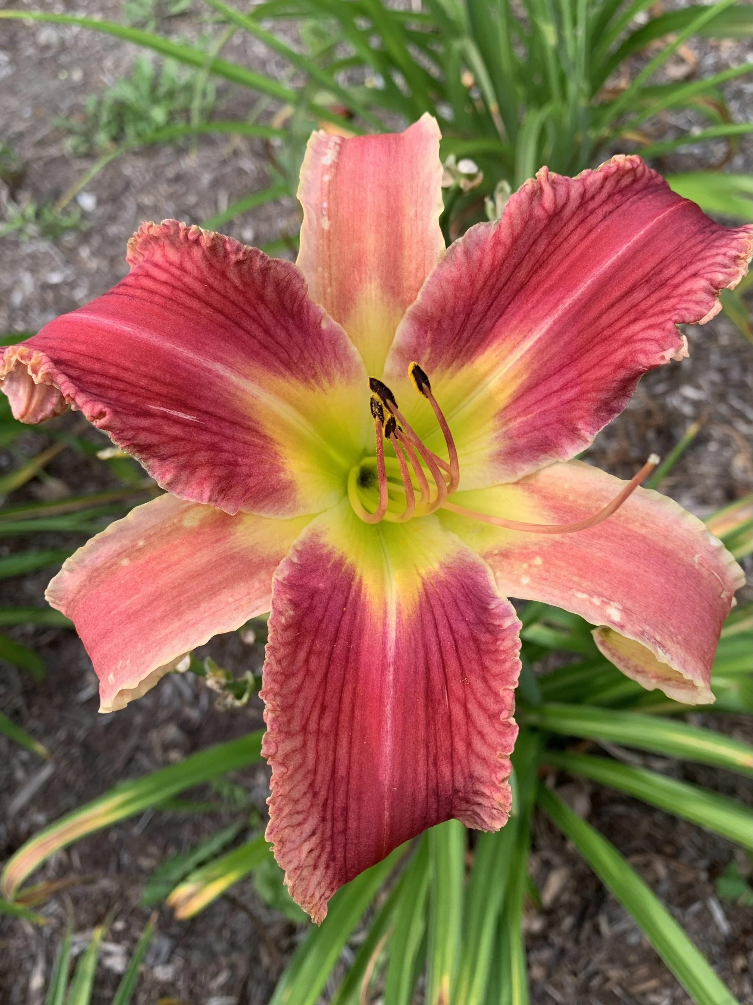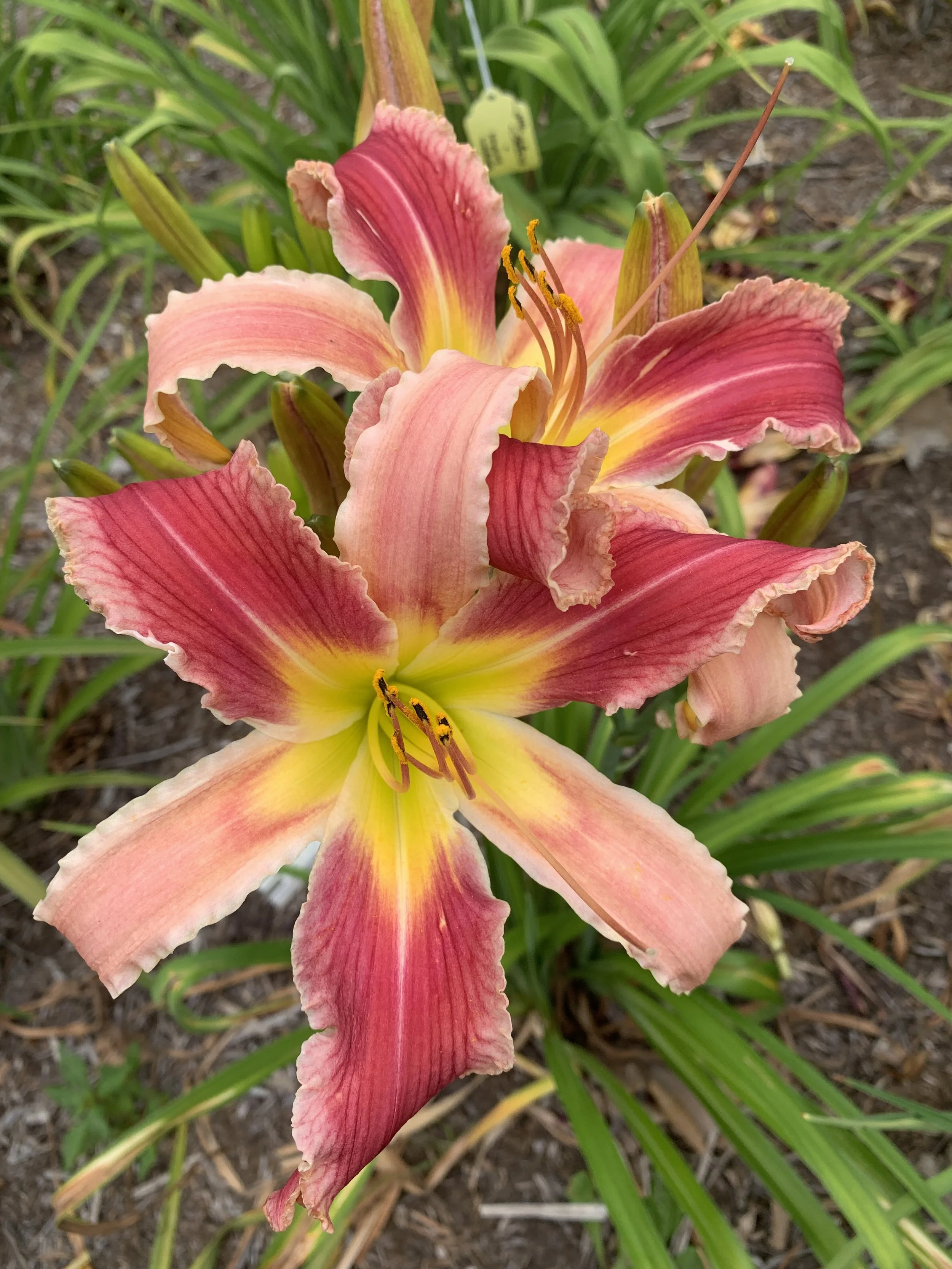 Petals are rose pink and the paler pink sepals have a rose pencil eye, the ruffled edge on petals and sepals is creamy baby pink, clear green throat.
