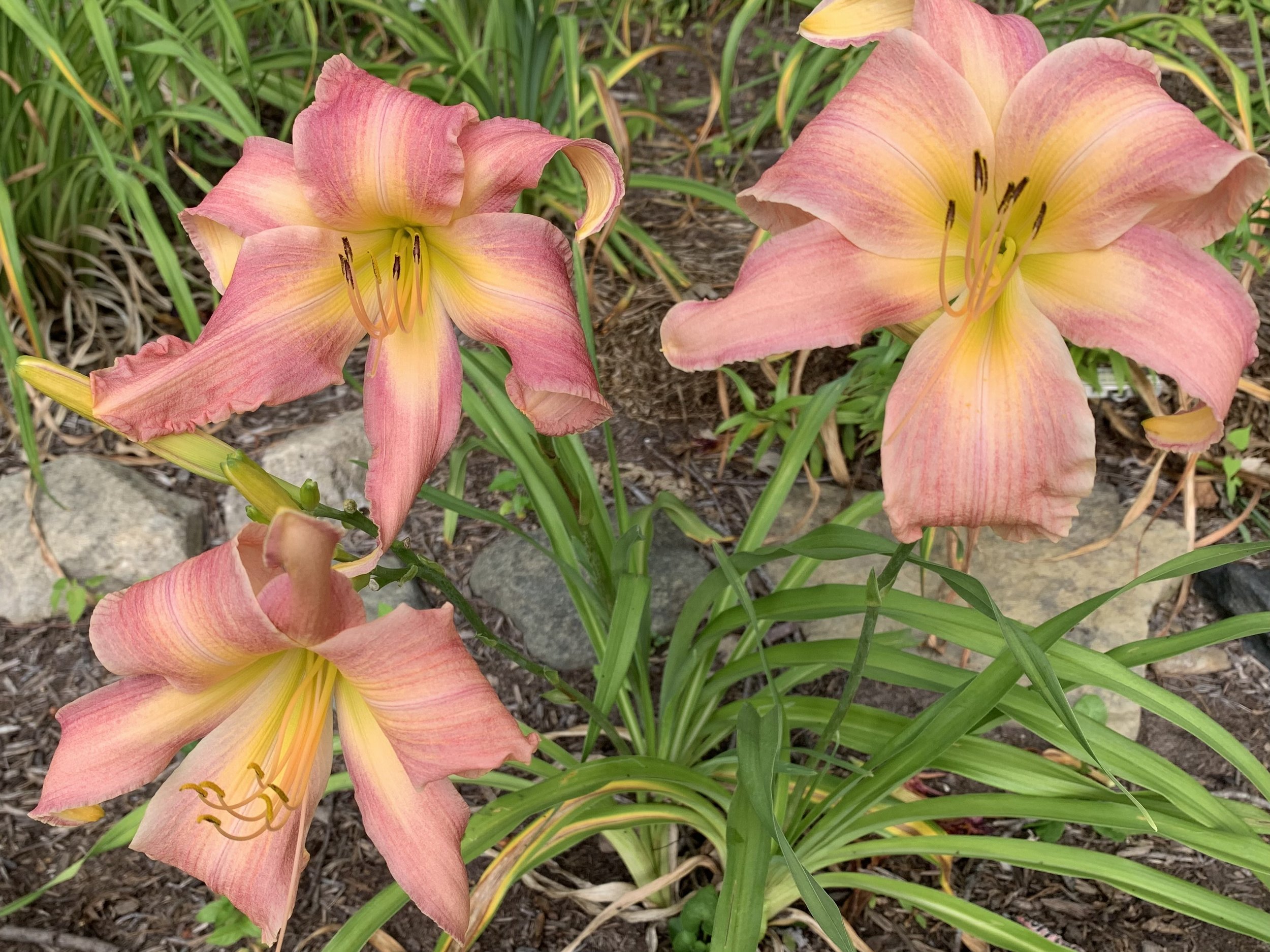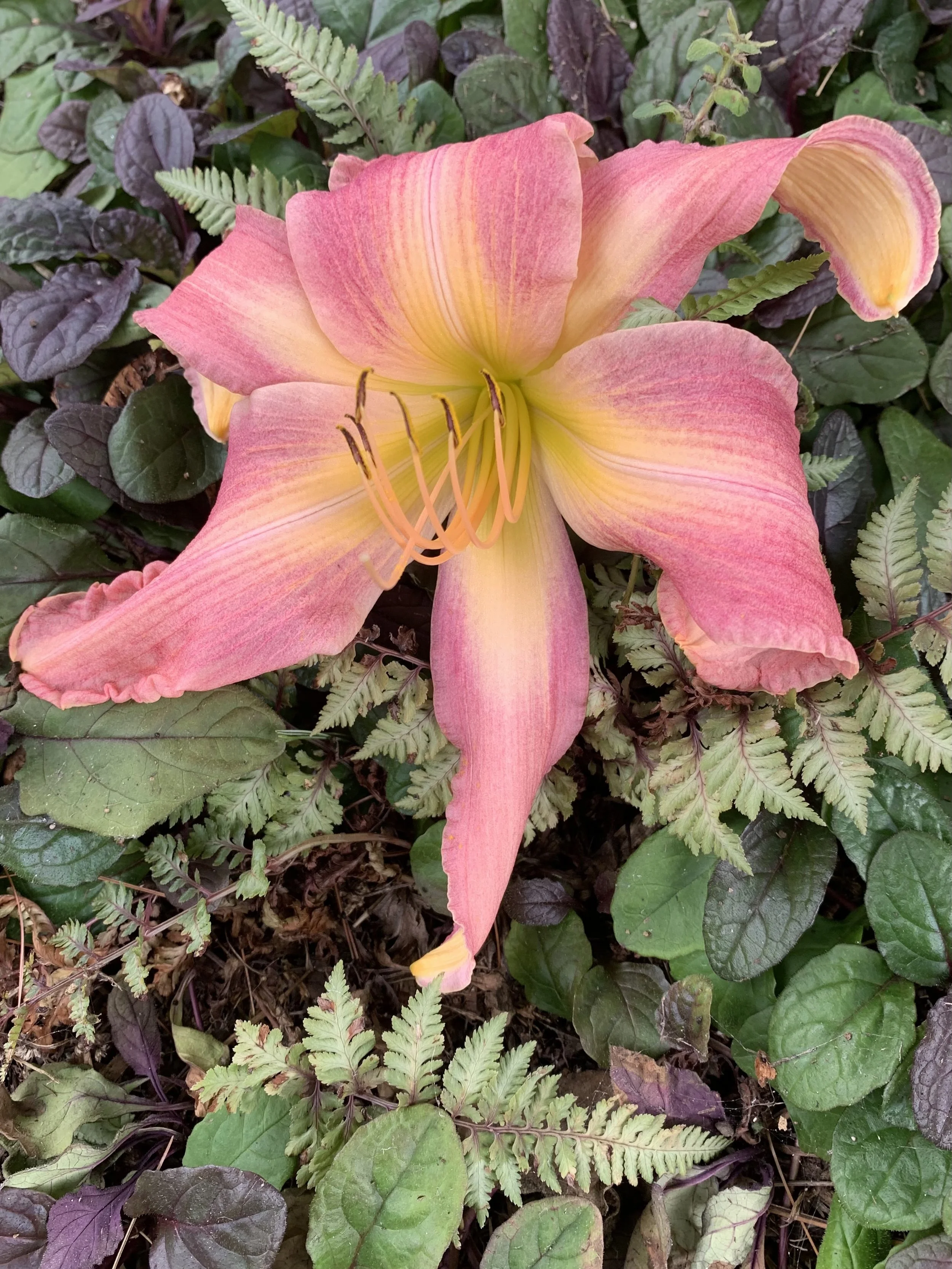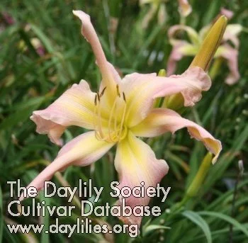 Yellow cream to pink rose blend with rose edge above yellow throat.