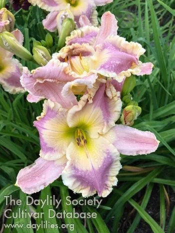 Lilac pink with cream ruffled edge and watermark, yellow to green throat. Very fancy.