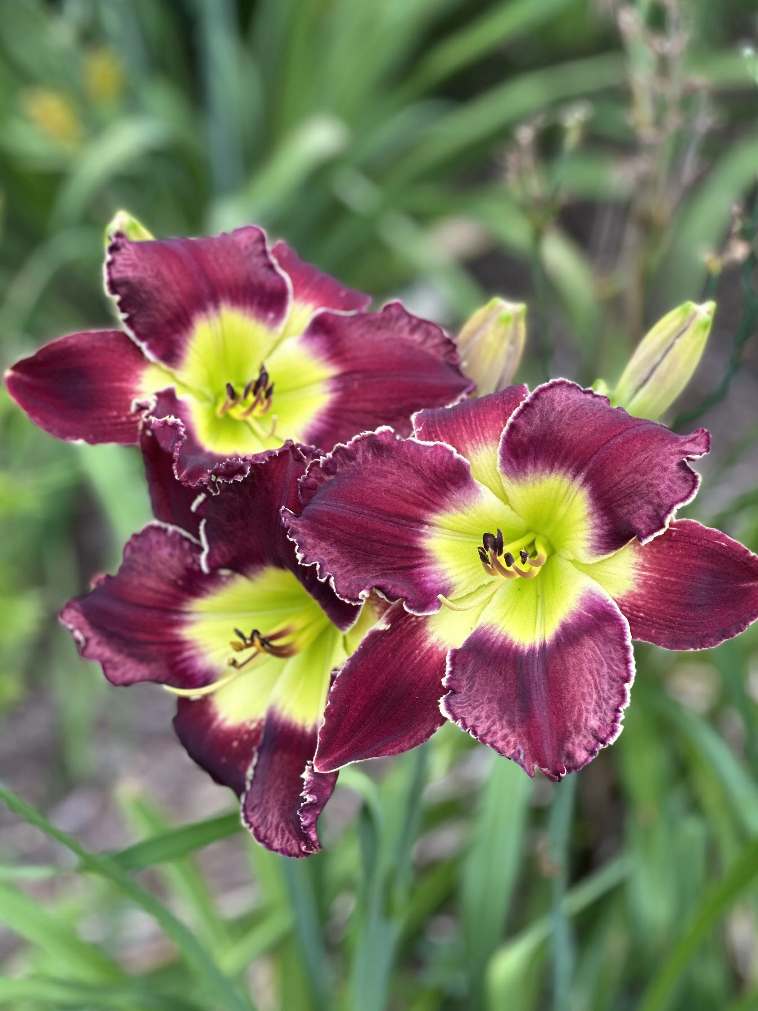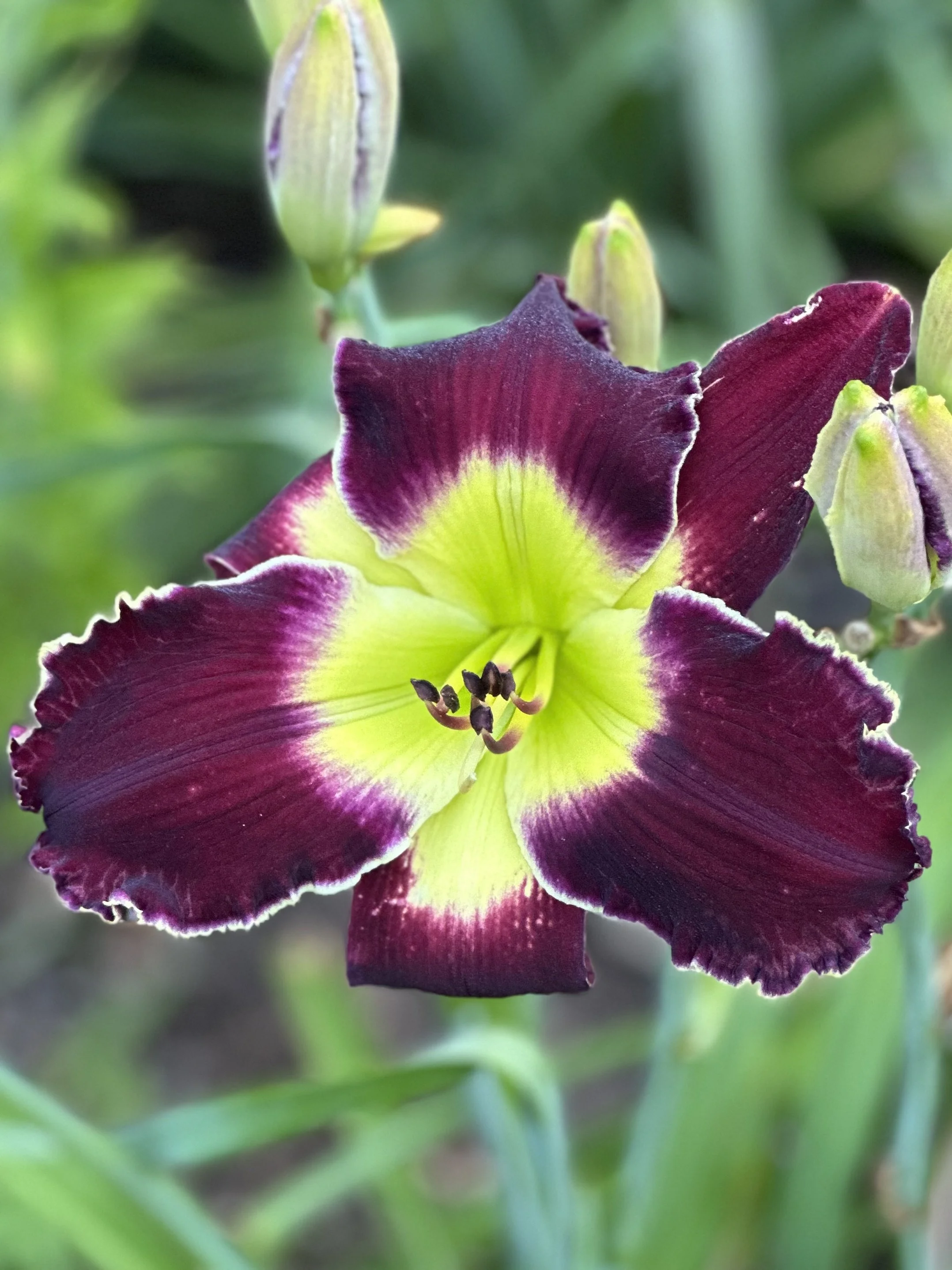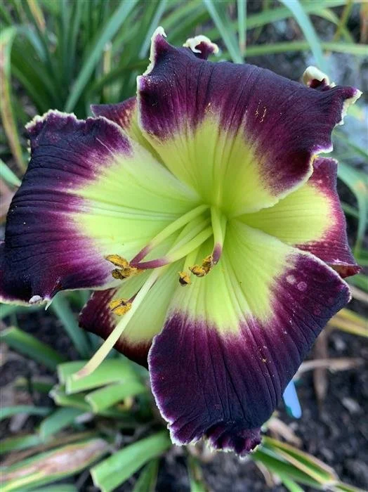 Purple with lighter eye-zone, white edge, and green throat. Great substance.
