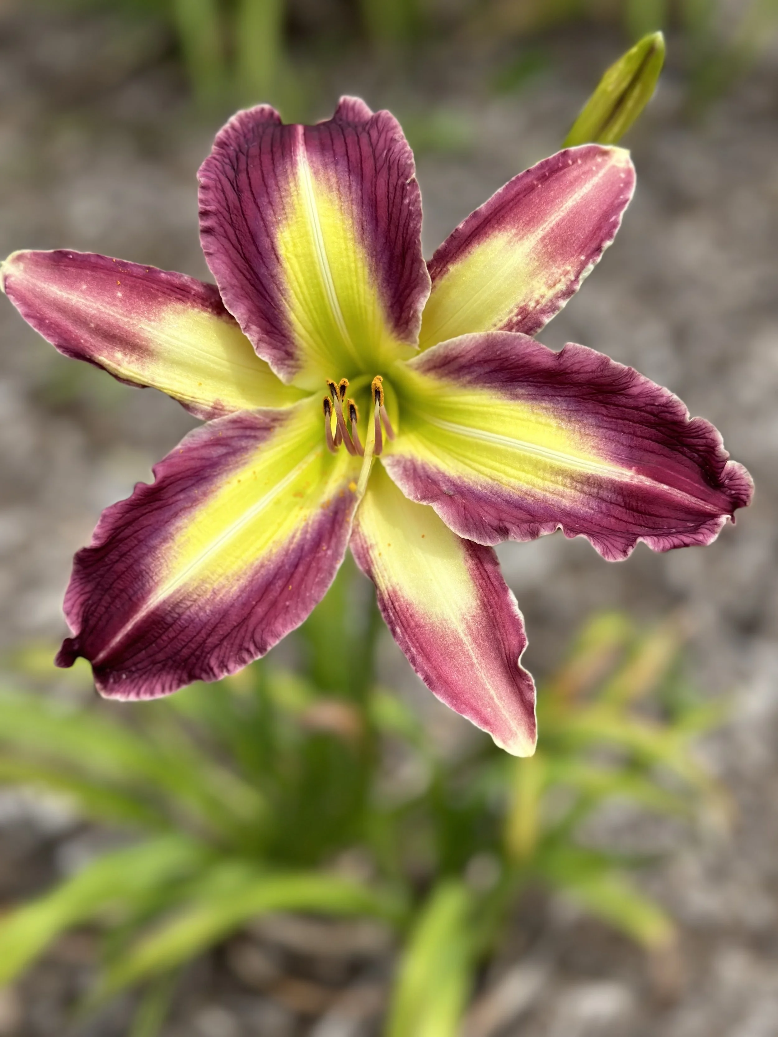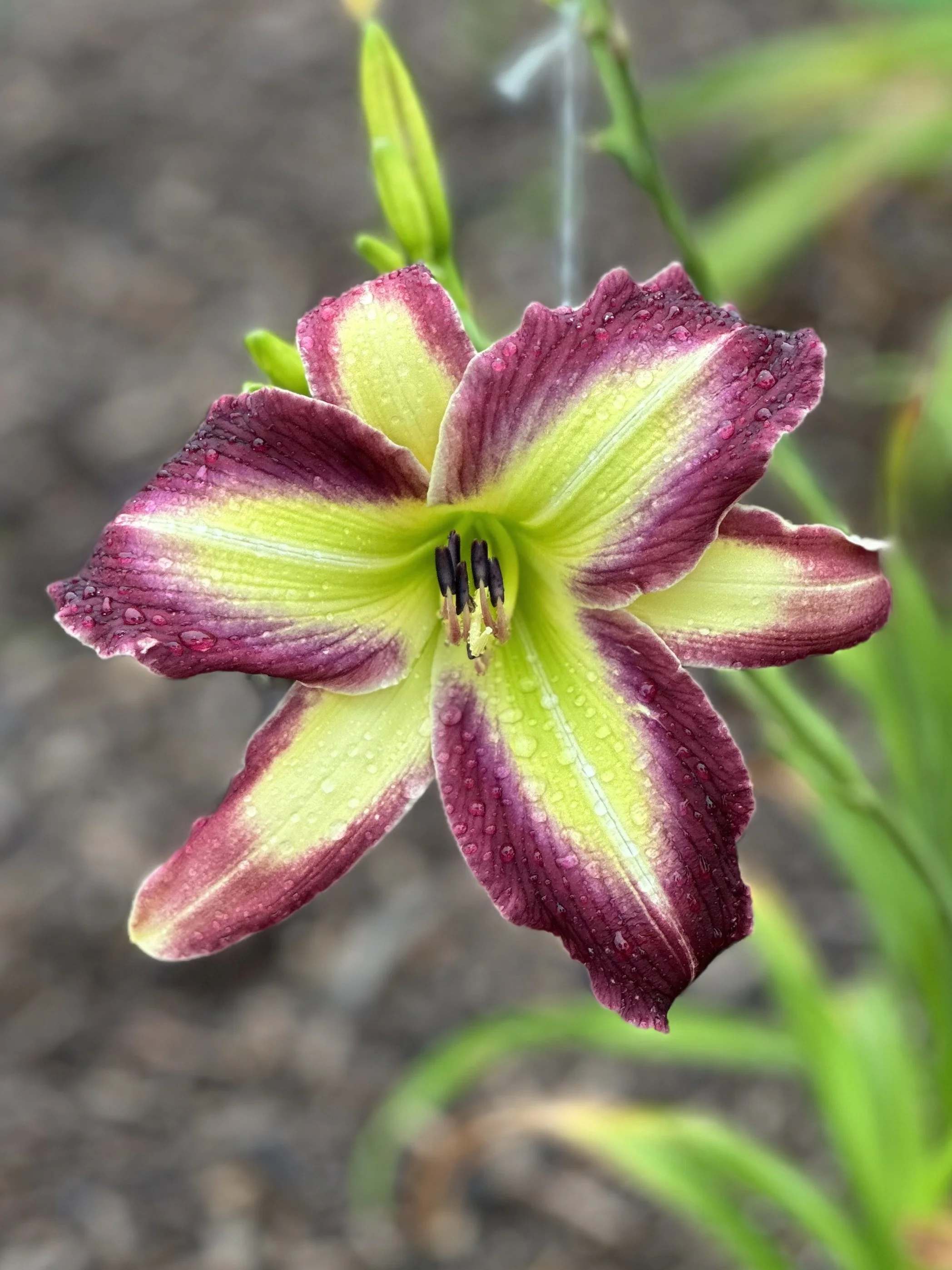 Long narrow dark purple petals with an extra large white to green throat that extends onto the sepals, fertile both ways. Great garden plant.