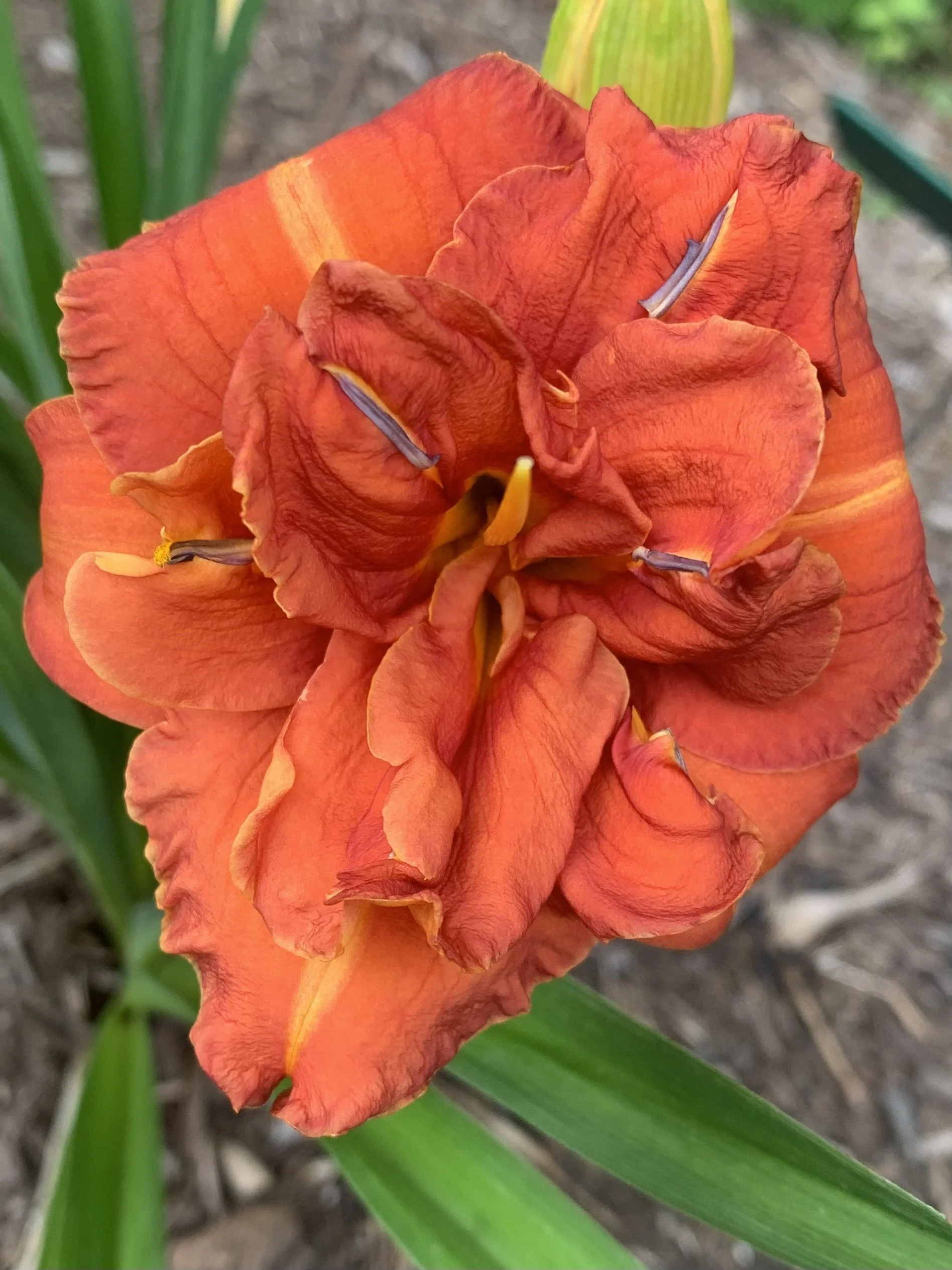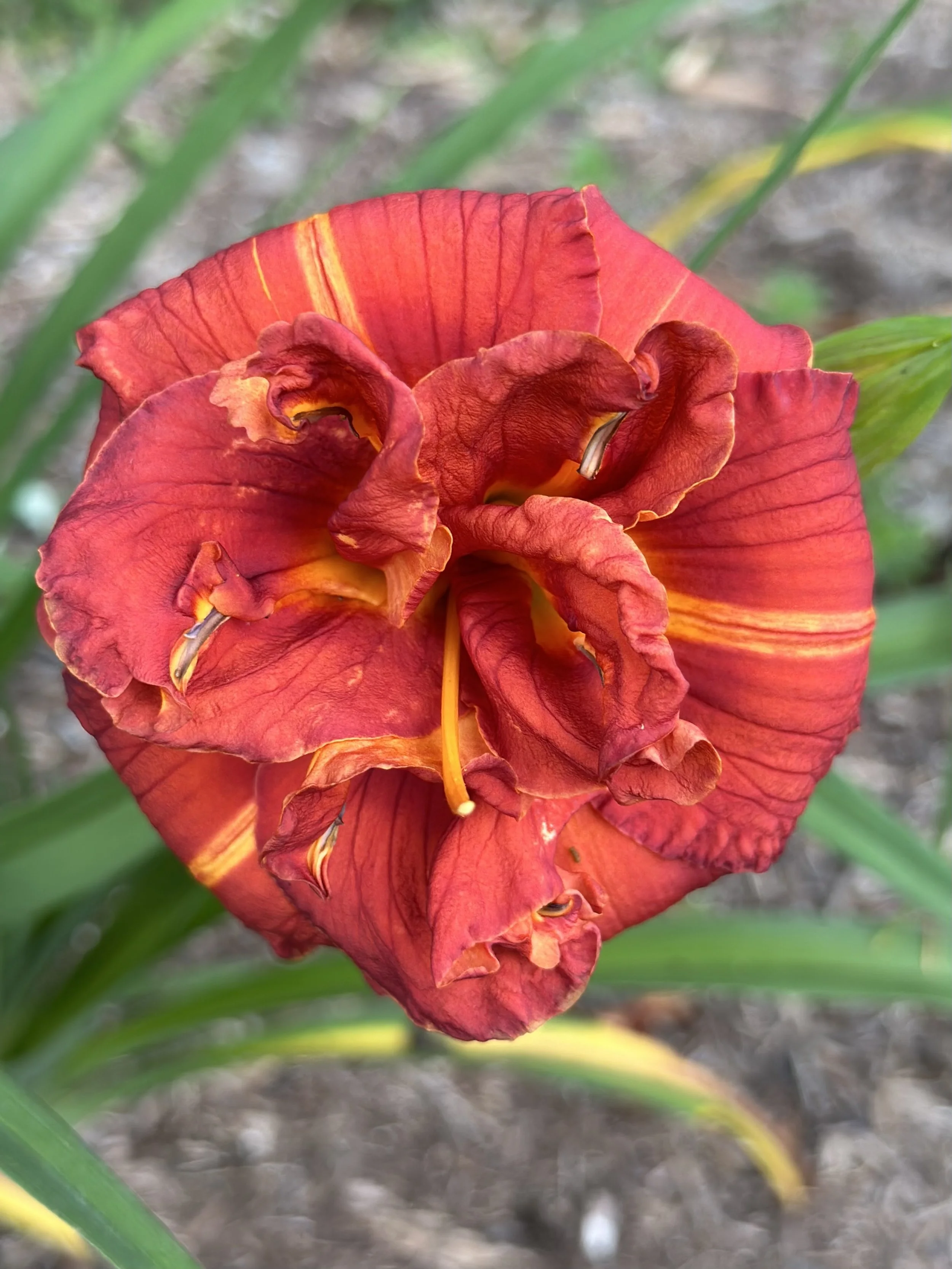 Copper red with very distinct yellow midribs on the petals. A fantastic small double.