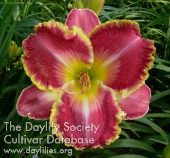 Cherry pink with pale pink watermark and bright yellow ruffled edge over yellow to green throat.