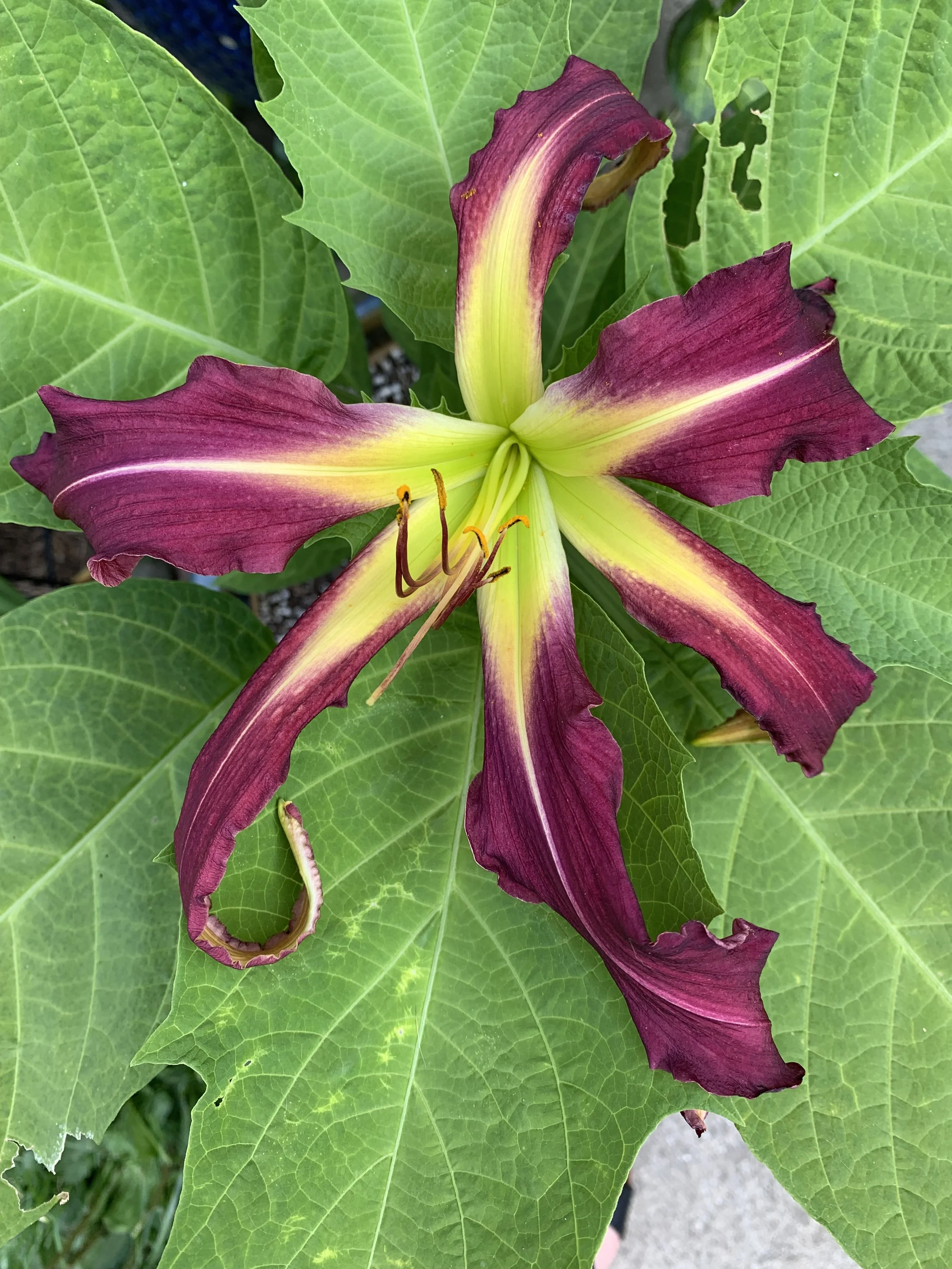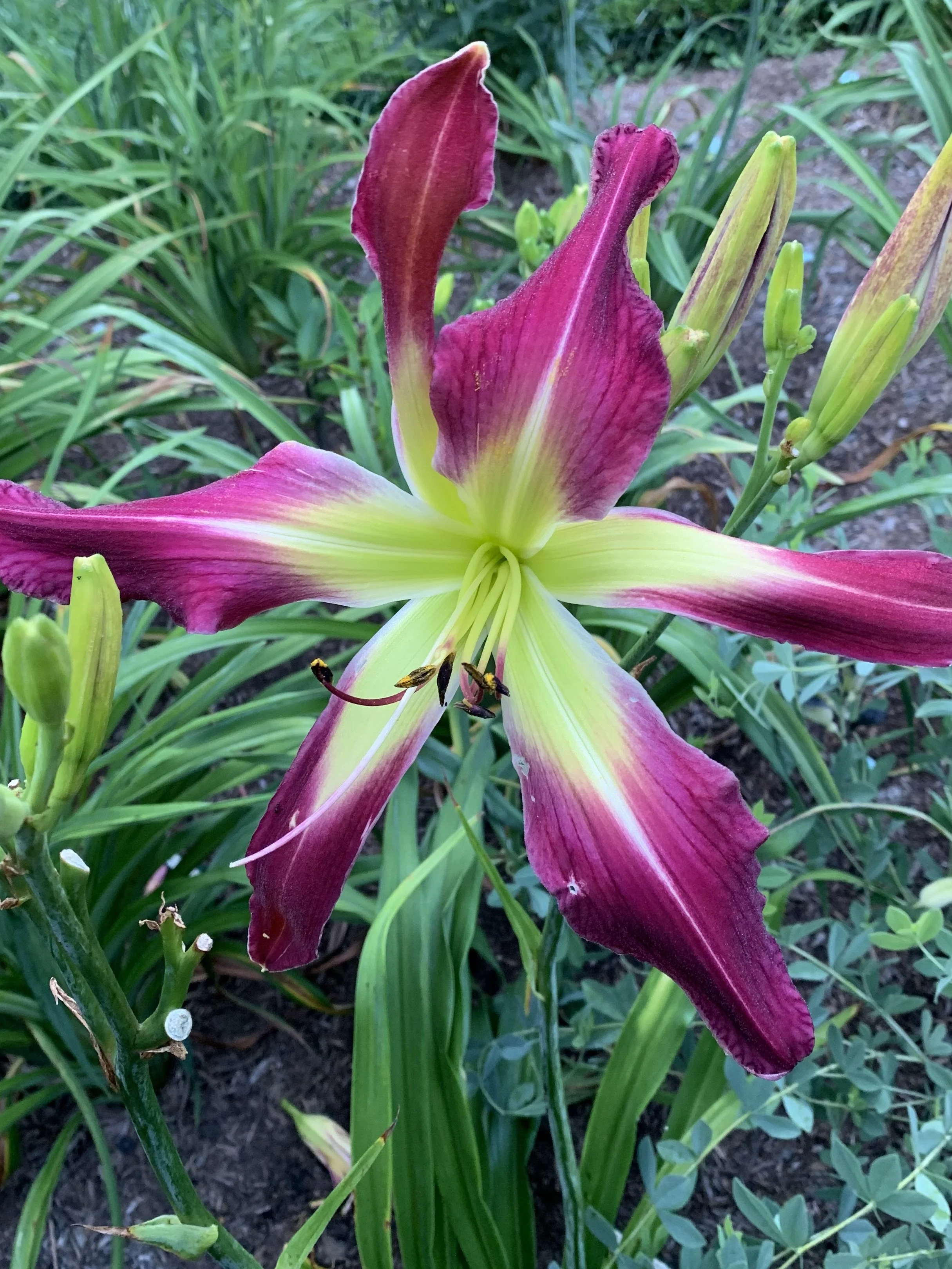 Burgundy purple self with a very large green throat that extends onto both petals and sepals. Huge unique bloom.
